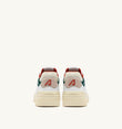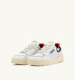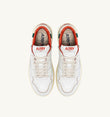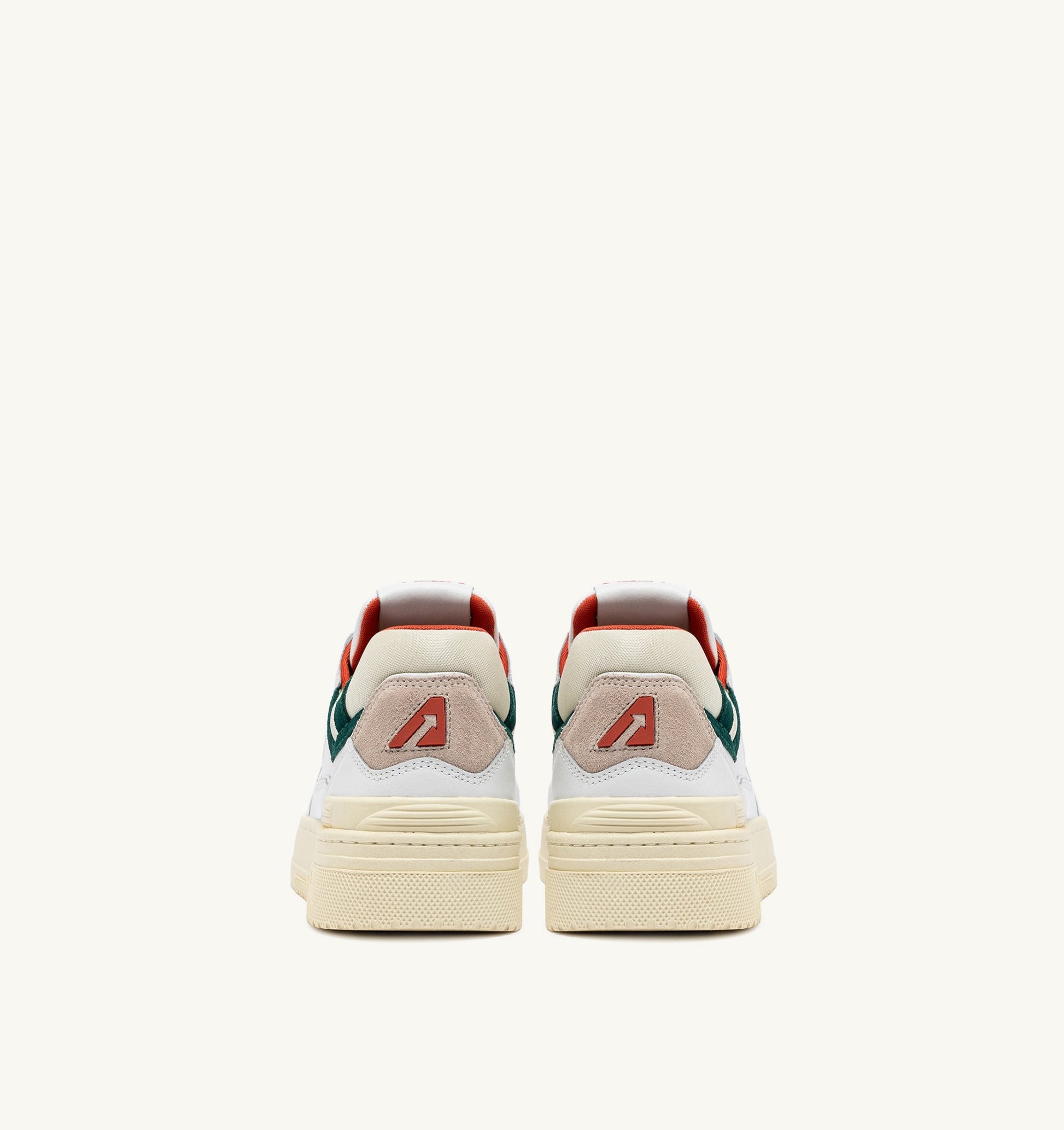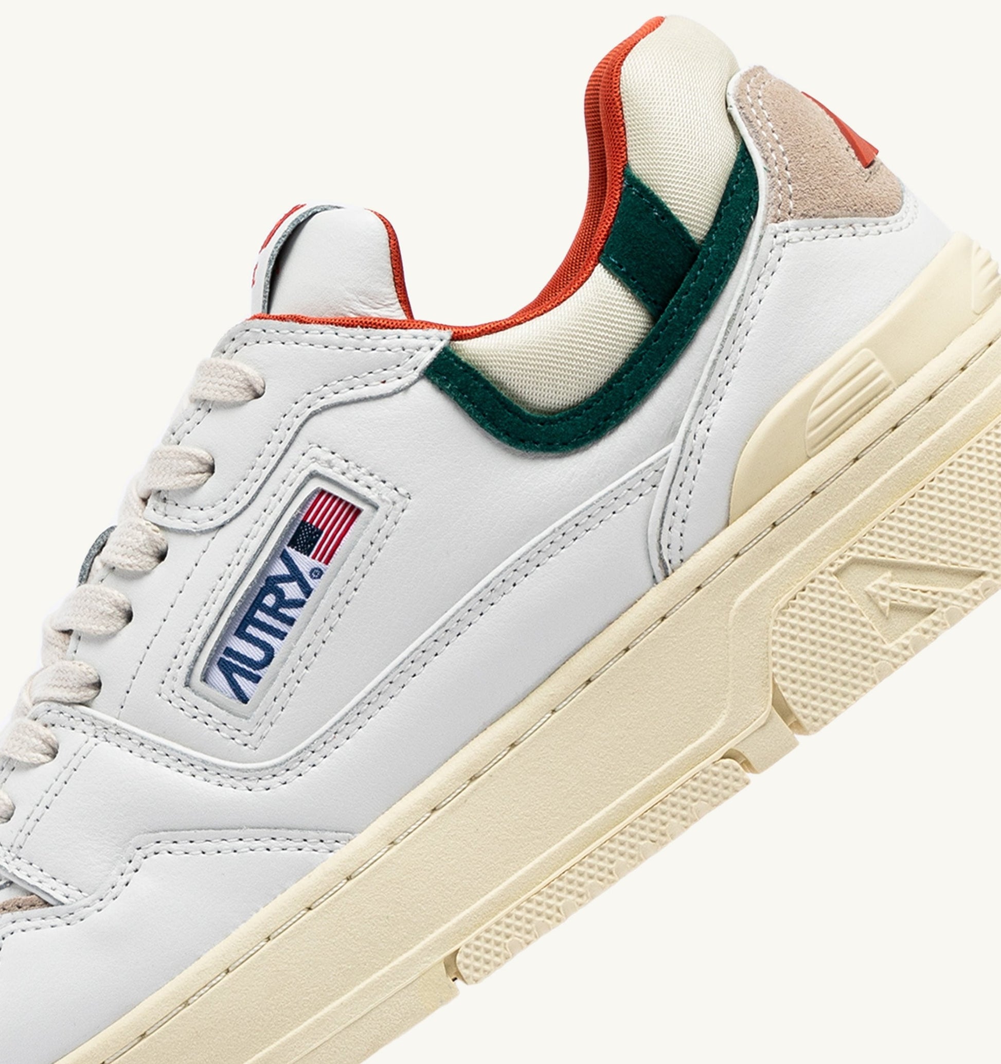 Ce modèle pour homme est réalisé en cuir blanc, avec des empiècements en suede vert et beige. Il se distingue par sa silhouette bold et confortable, un col en mesh rembourré et un renfort interne au talon qui offre un maintien supplémentaire. Son élément signature : une semelle haute en caoutchouc avec un battistrada à relief qui affirme toute l’énergie street du design.