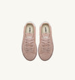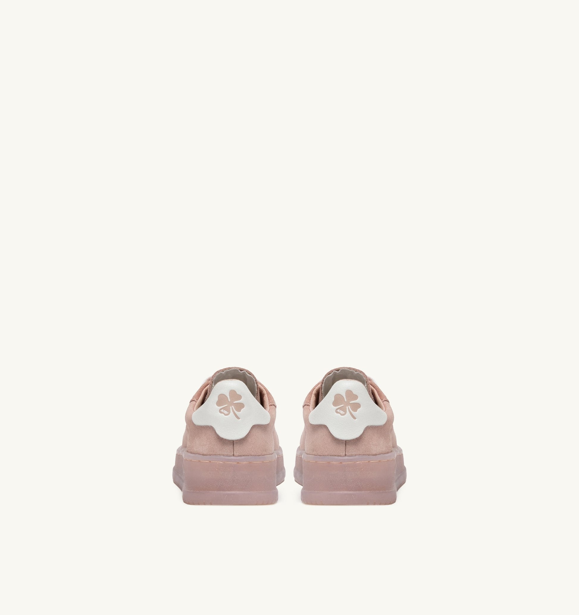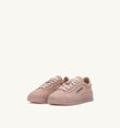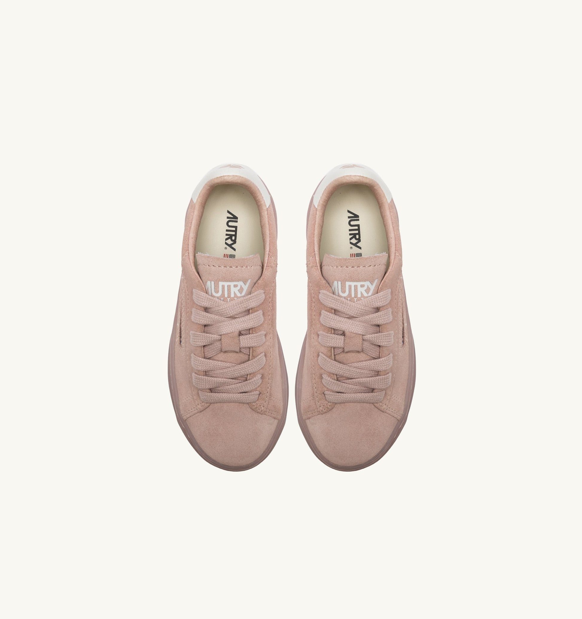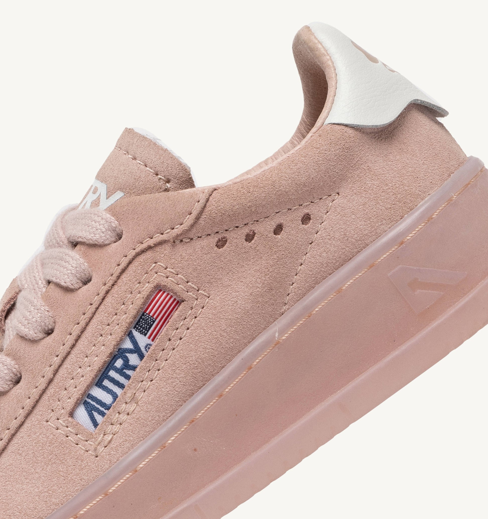 Réalisées en suede rose avec le talon blanc caractéristique, elles reposent sur une confortable semelle en caoutchouc transparente et se distinguent par les détails authentiques et le logo typique d’Autry.