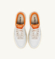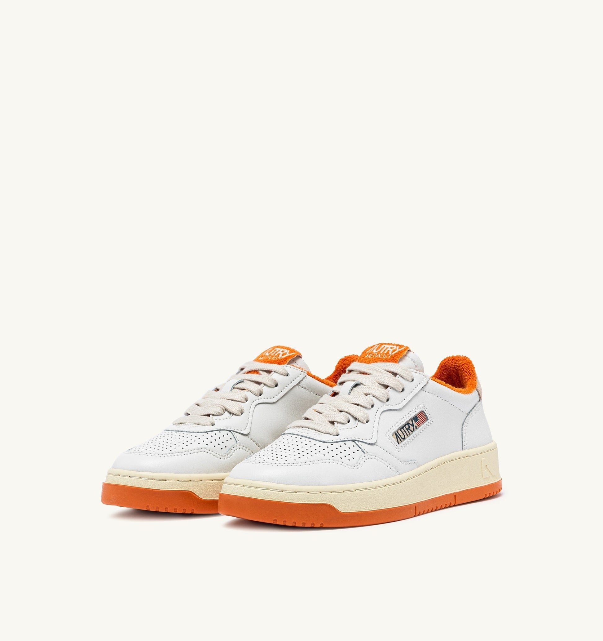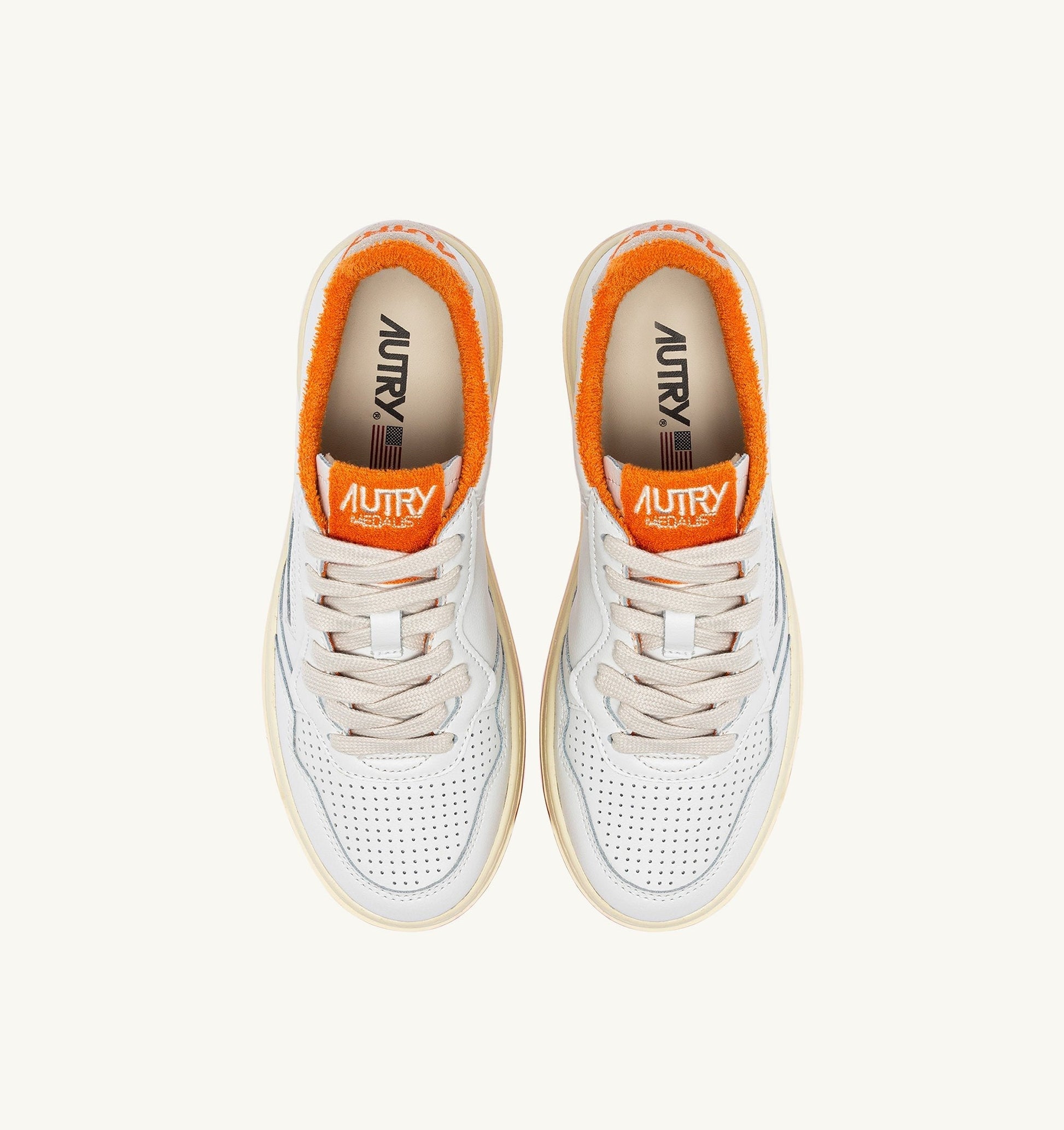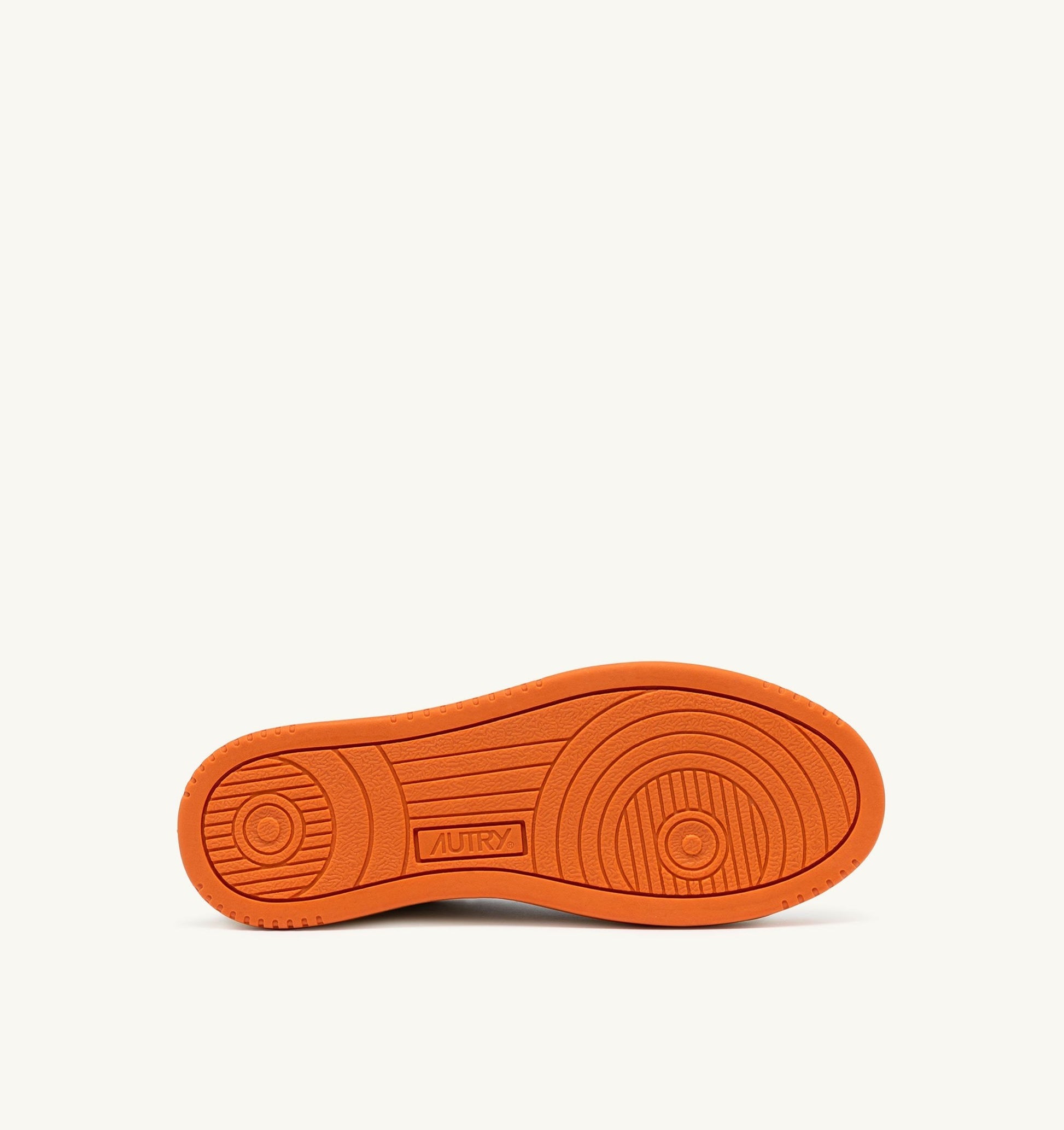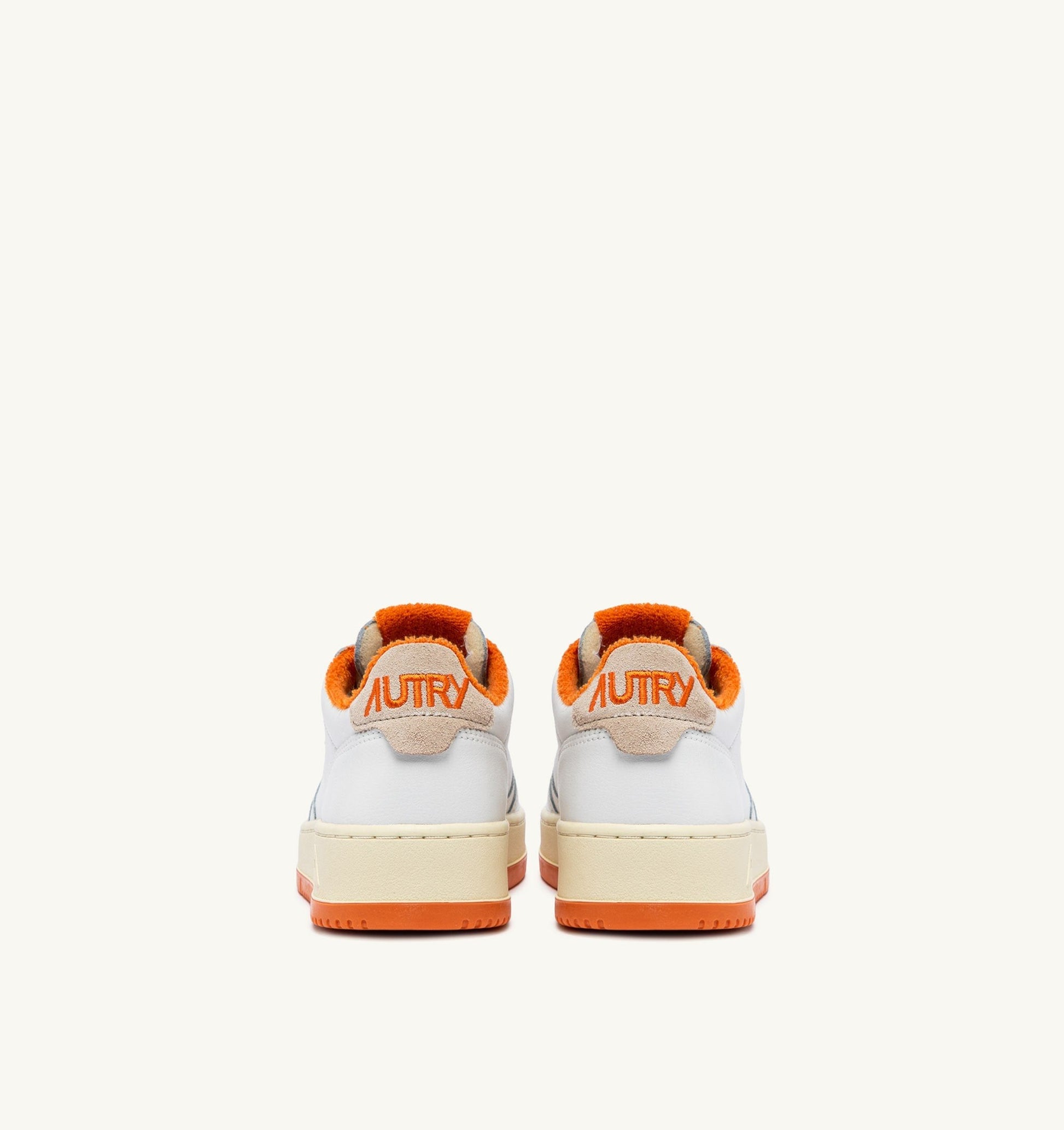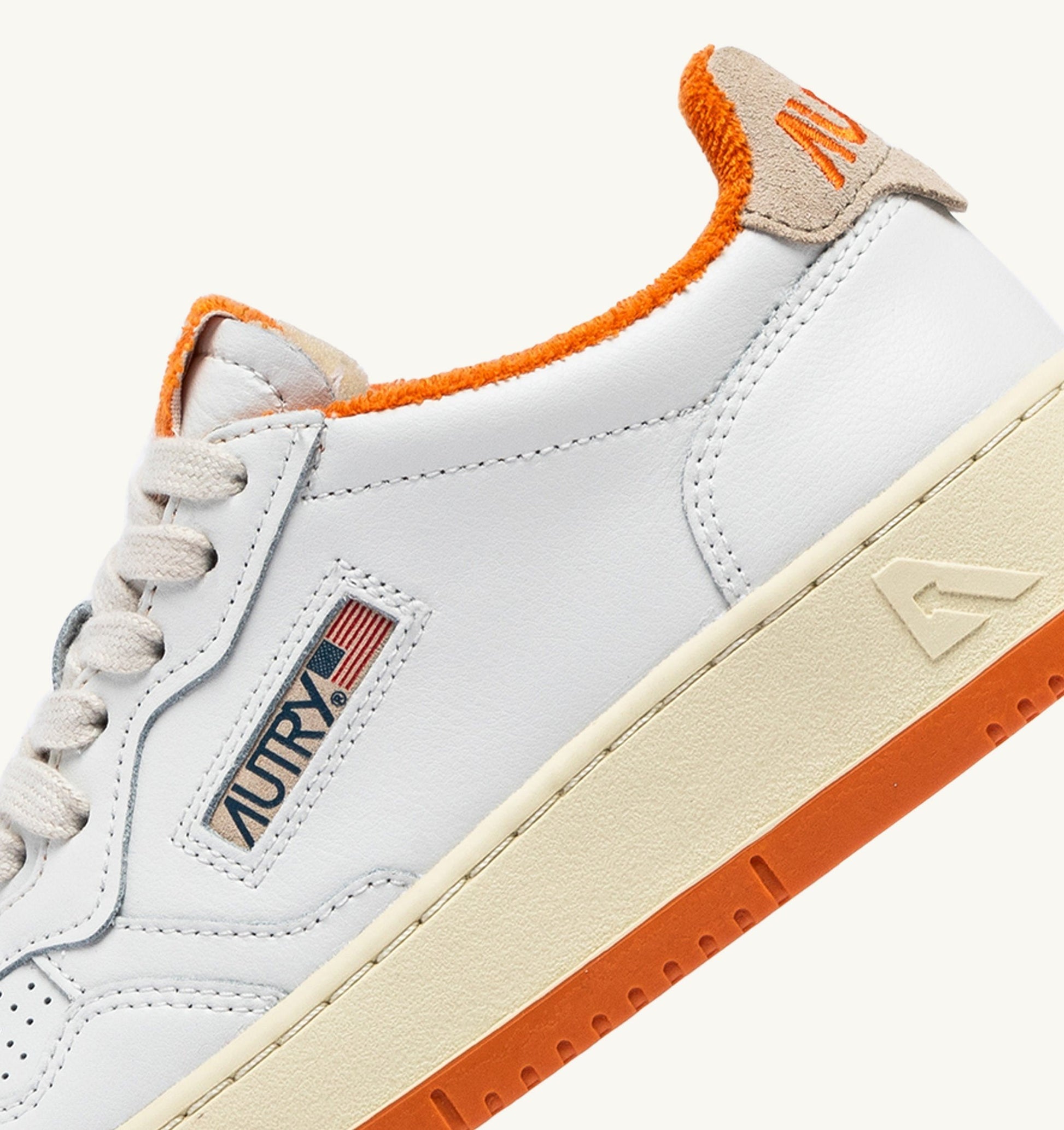 Ce modèle pour homme est confectionné en cuir blanc, agrémenté de détails en éponge orange et d’un talon en suede logoté. La pointe perforée améliore la respirabilité, tandis que le logo latéral Autry et la semelle à contraste viennent personnaliser le look avec caractère.