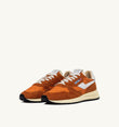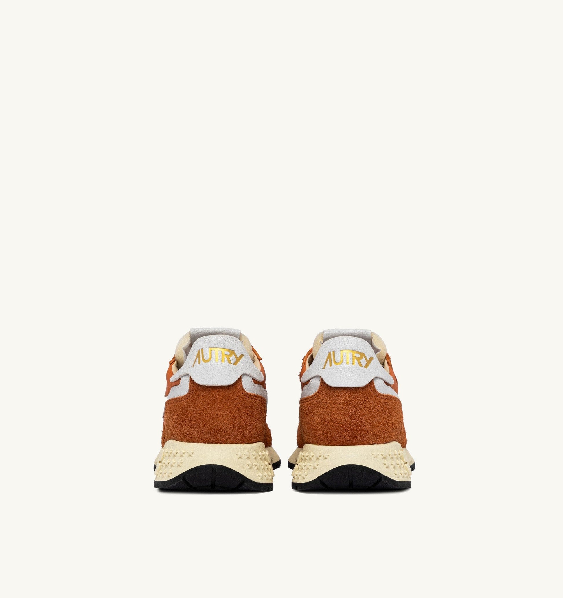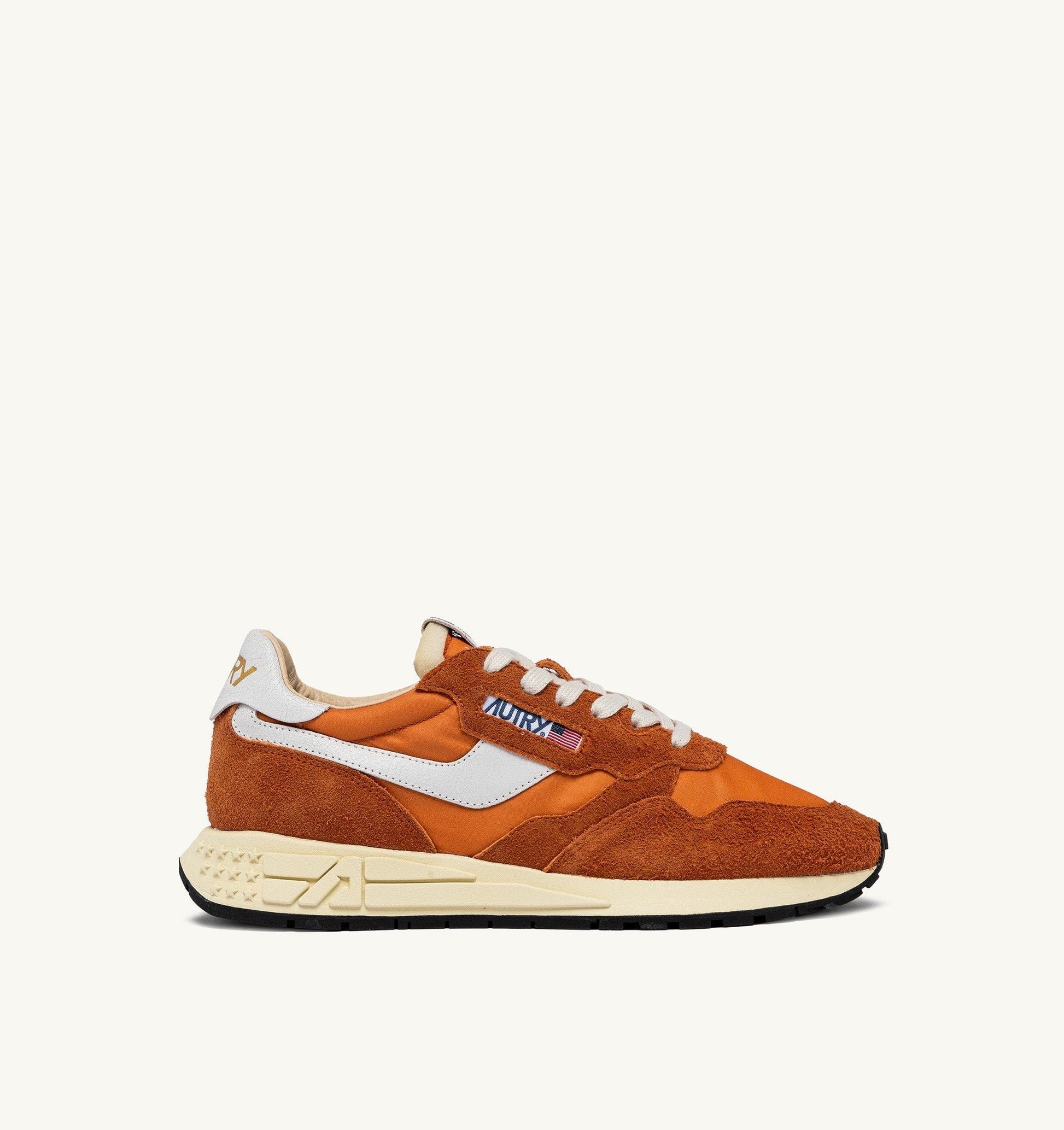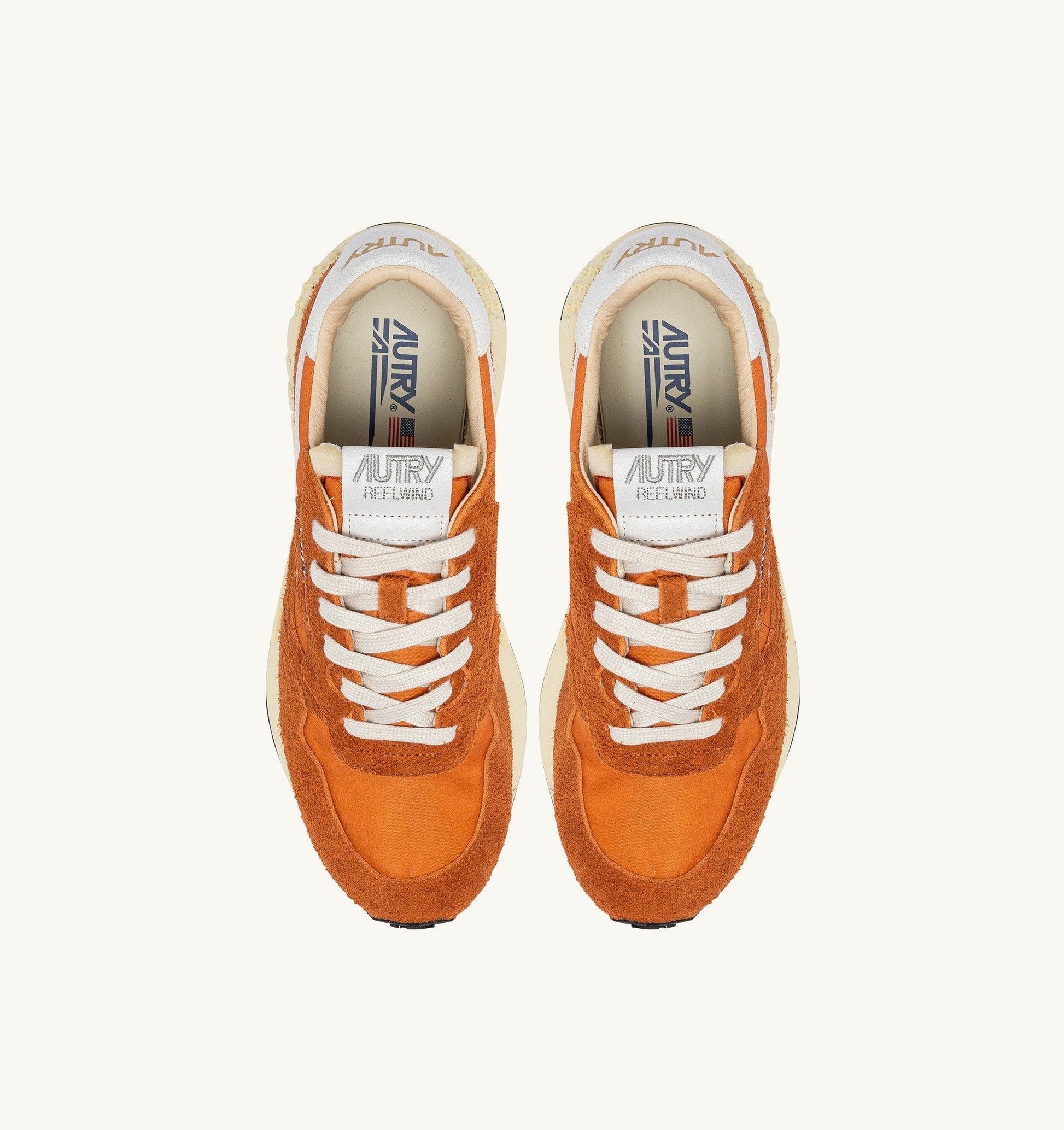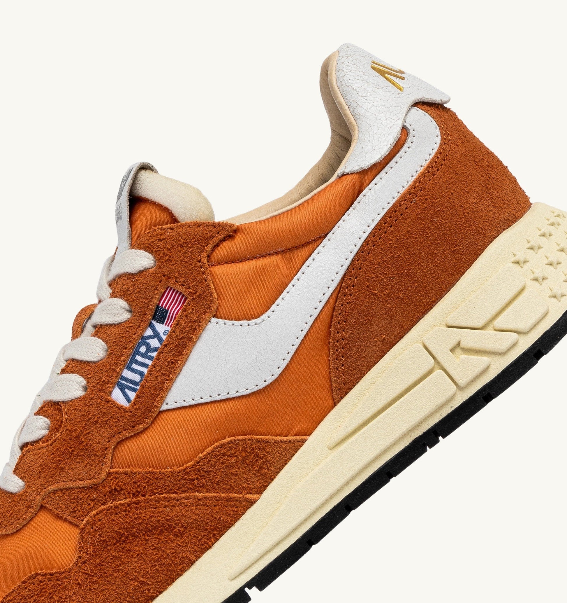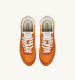 Ce modèle pour homme est réalisé dans un mélange de suede et nylon orange, avec des empiècements latéraux en cuir blanc effet craquelé, pour un contraste fort et un style affirmé.