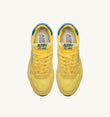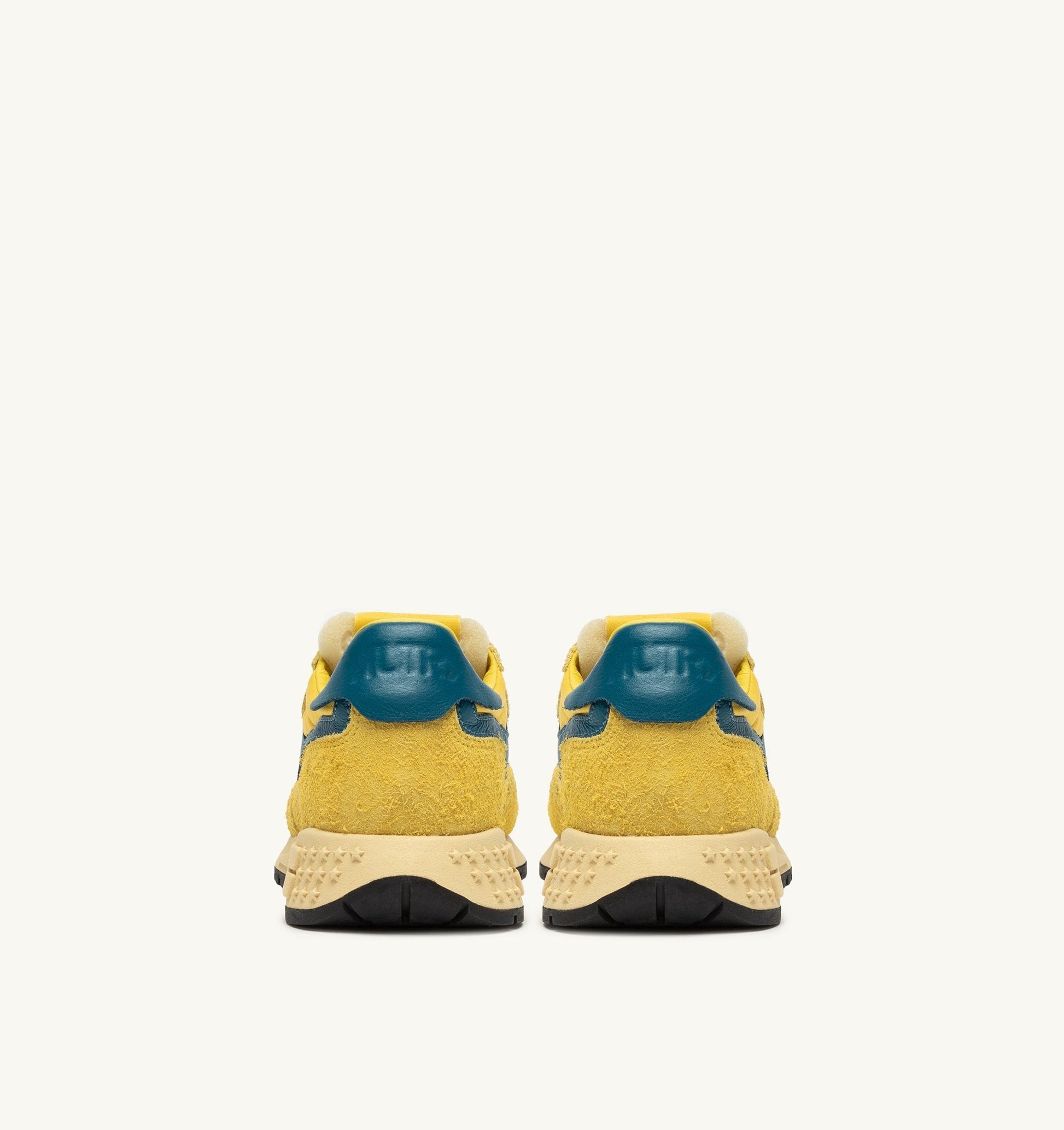 Ce modèle pour homme est conçu dans un mélange de nylon et suede jaune, avec des empiècements latéraux en cuir bleu qui lui donnent une allure résolument graphique.