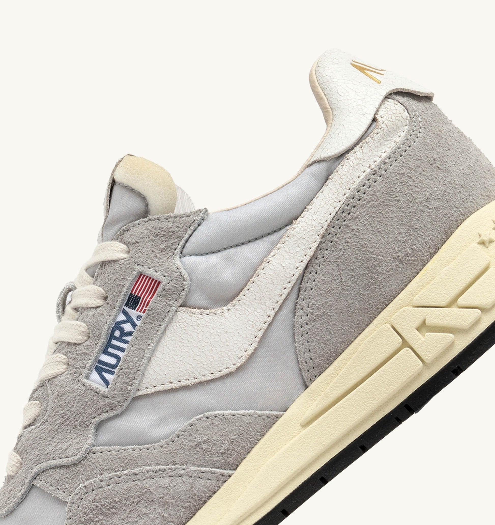 Ce modèle pour homme se distingue par une tige en nylon et suede gris, agrémentée d’empiècements en cuir blanc effet craquelé sur les côtés.