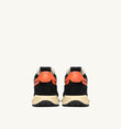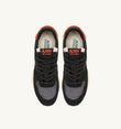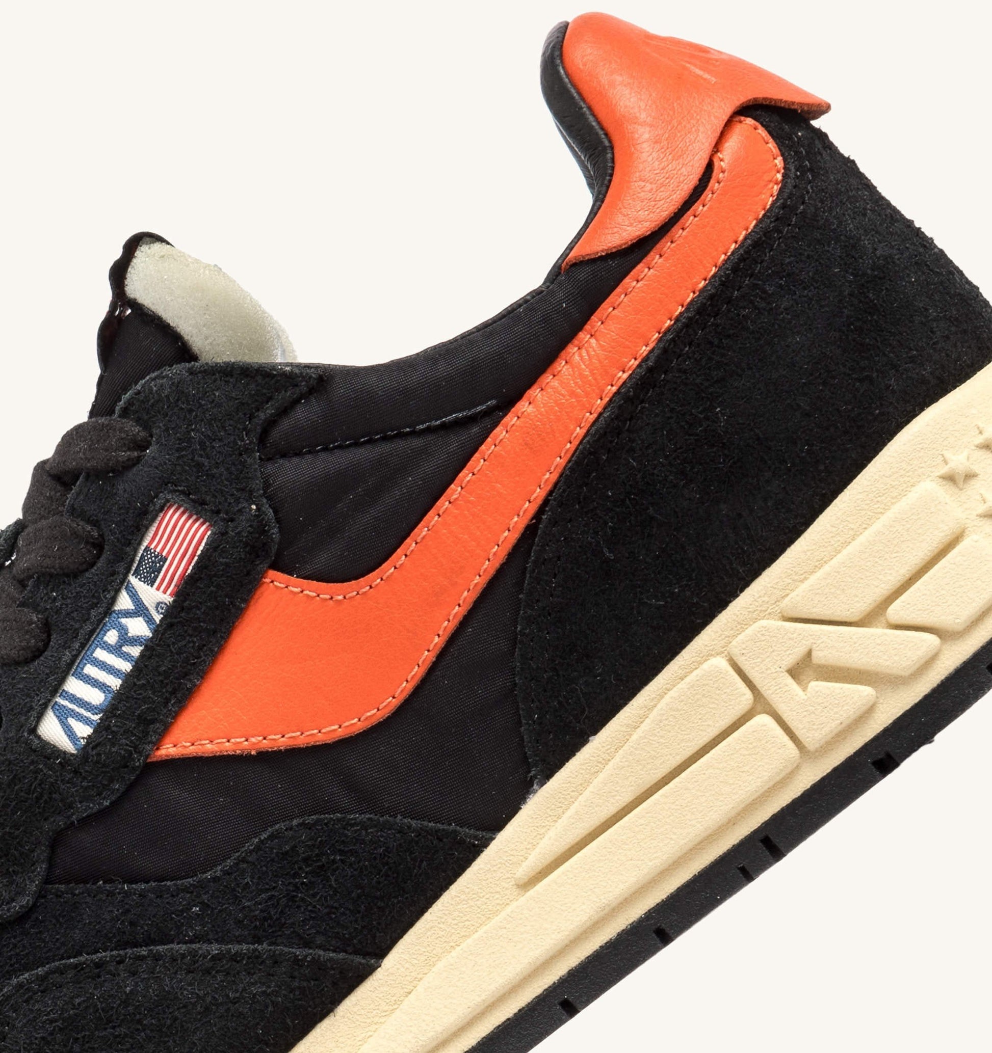 Ce modèle pour homme est confectionné dans un mix de nylon et suede noir, avec des empiècements latéraux en cuir orange pour un look audacieux et sportif.