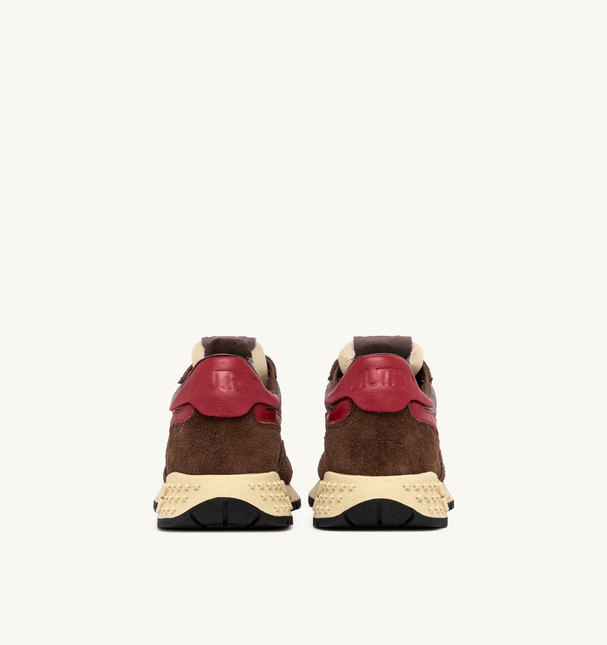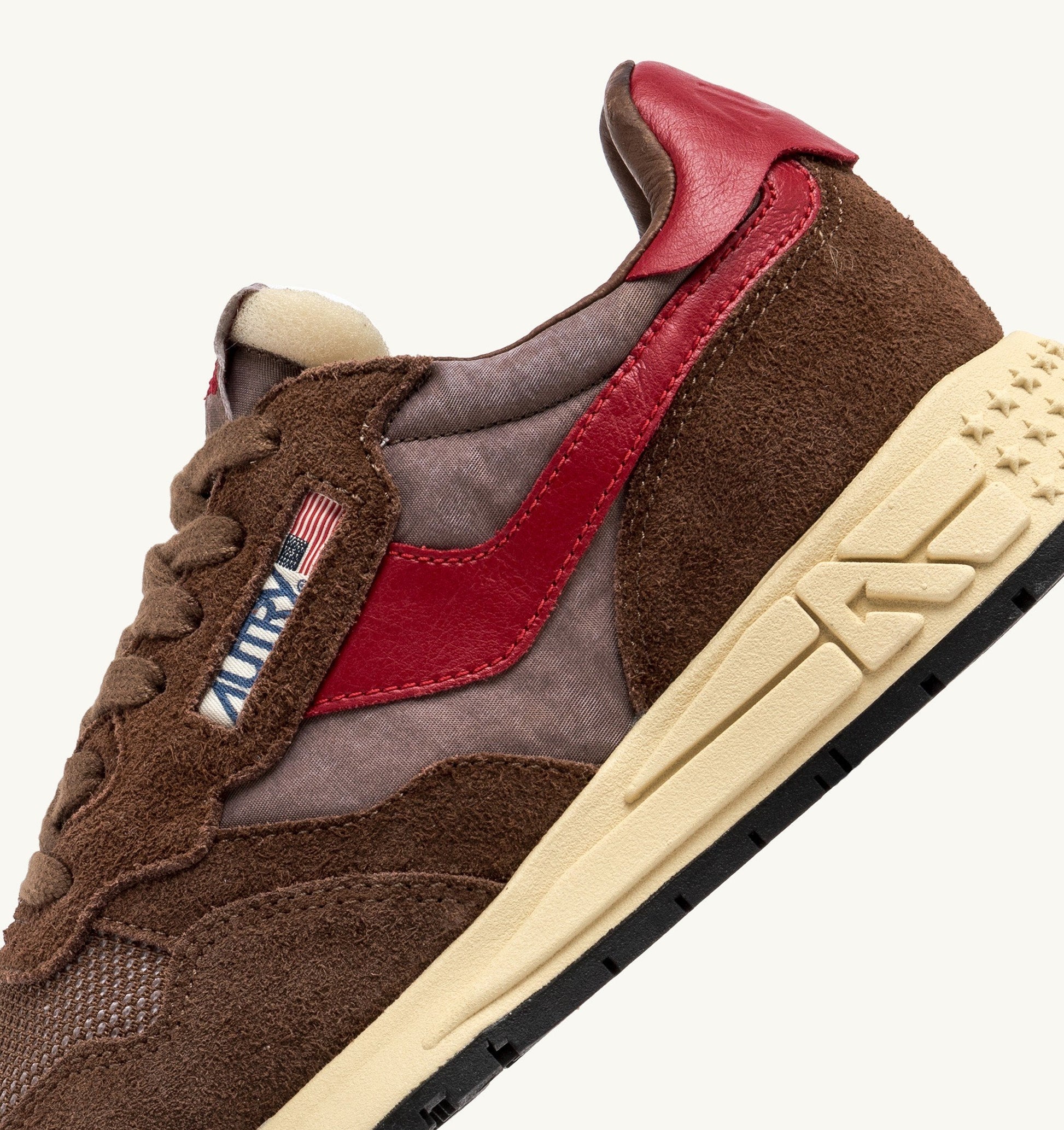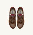 Ce modèle pour homme est conçu dans un mélange de nylon et suede marron, rehaussé d’empiècements latéraux en cuir rouge pour un contraste fort et affirmé.