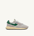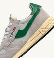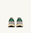 Ce modèle pour homme est réalisé dans un mélange de nylon et suede beige, rehaussé d’empiècements latéraux en cuir vert pour une touche graphique et distinctive.