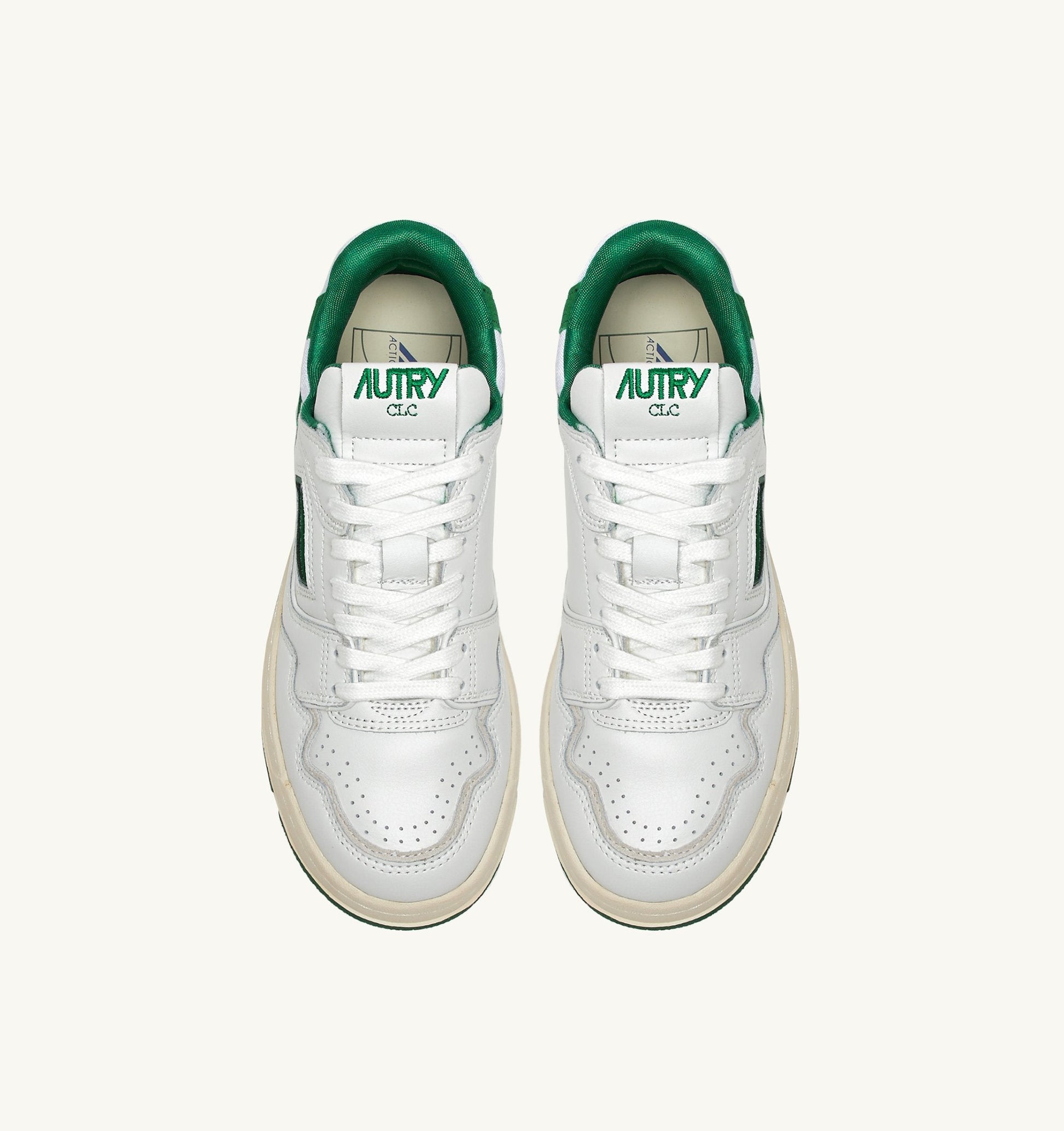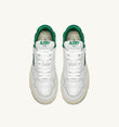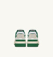Ce modèle pour femme est réalisé en cuir blanc avec des détails en suède vert. Elle se caractérise par une forme audacieuse et enveloppante, avec un col en mesh rembourré et une protection intérieure qui offre un soutien supplémentaire au talon. Son trait distinctif est la semelle haute en caoutchouc avec une semelle extérieure en relief alternant blanc et vert, qui met en valeur l’énergie street du design.