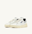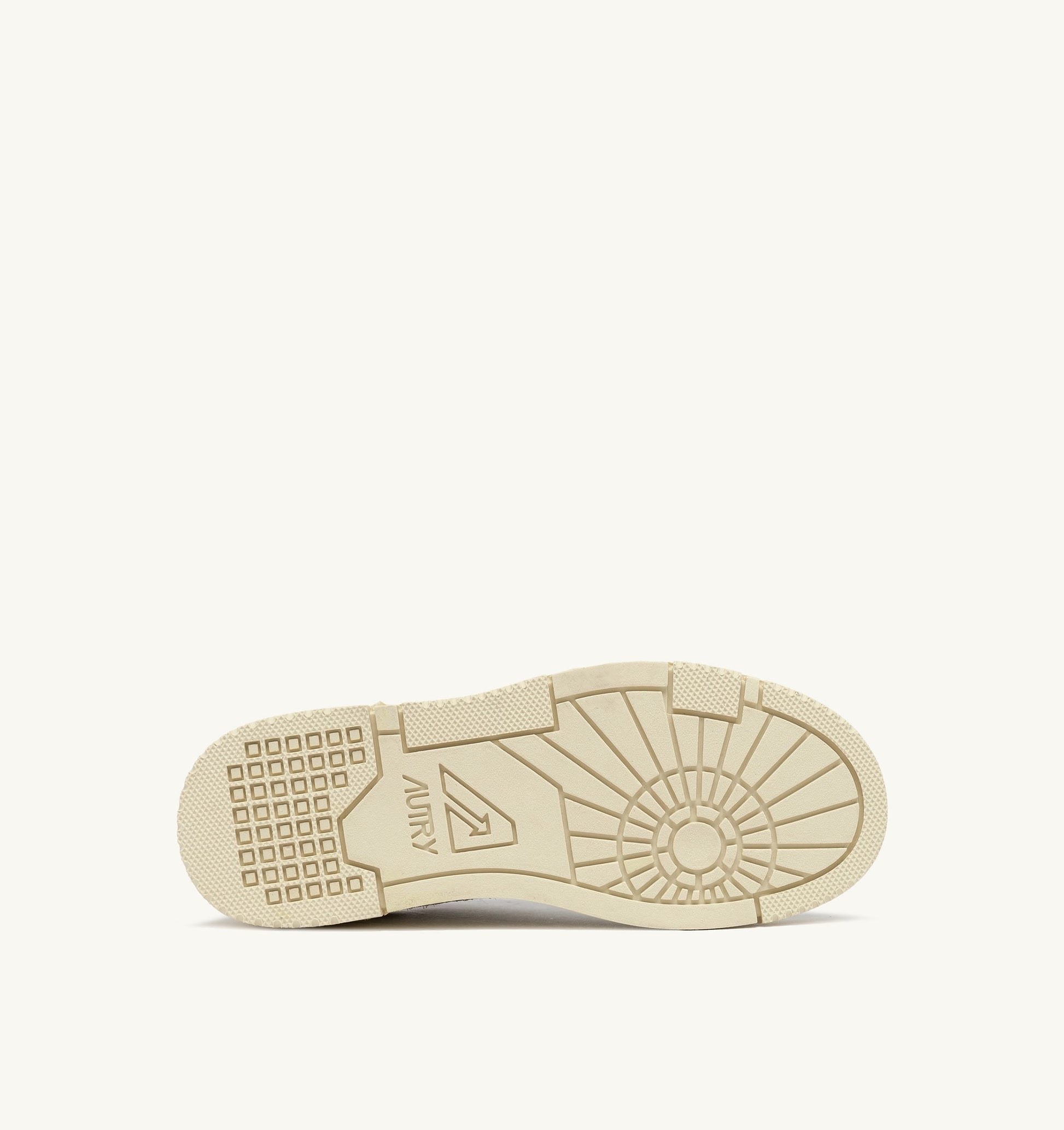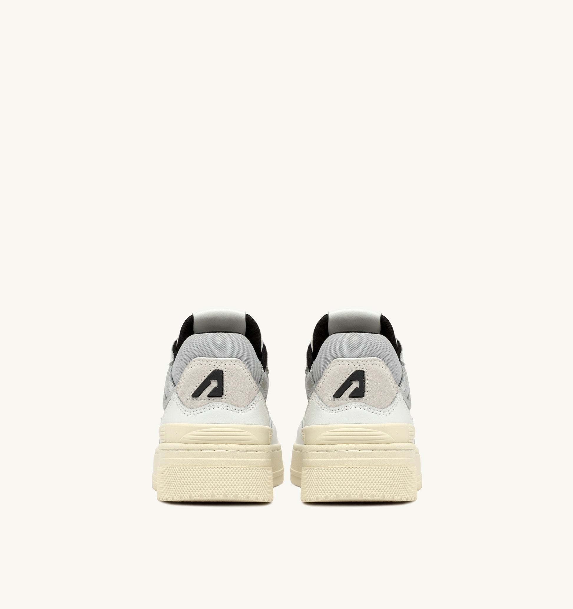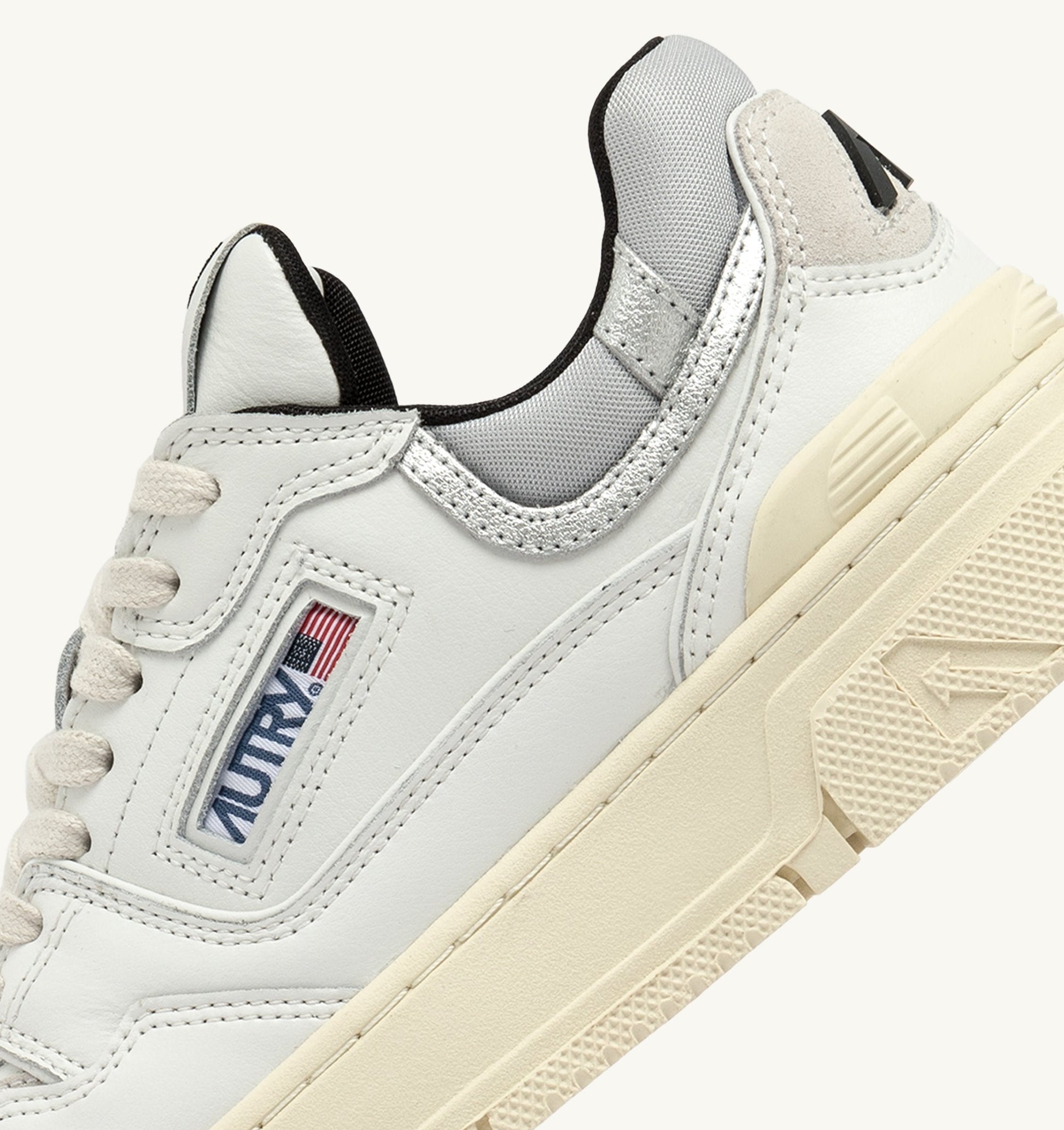 Ce modèle pour femme est réalisé en cuir blanc avec des inserts en cuir métallisé argent et suede beige. Il se distingue par une forme audacieuse et confortable, avec un col en mesh rembourré et une protection interne offrant un soutien supplémentaire au talon. Le détail distinctif est la semelle haute en caoutchouc avec une semelle extérieure en relief qui accentue l’énergie street du design.