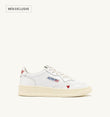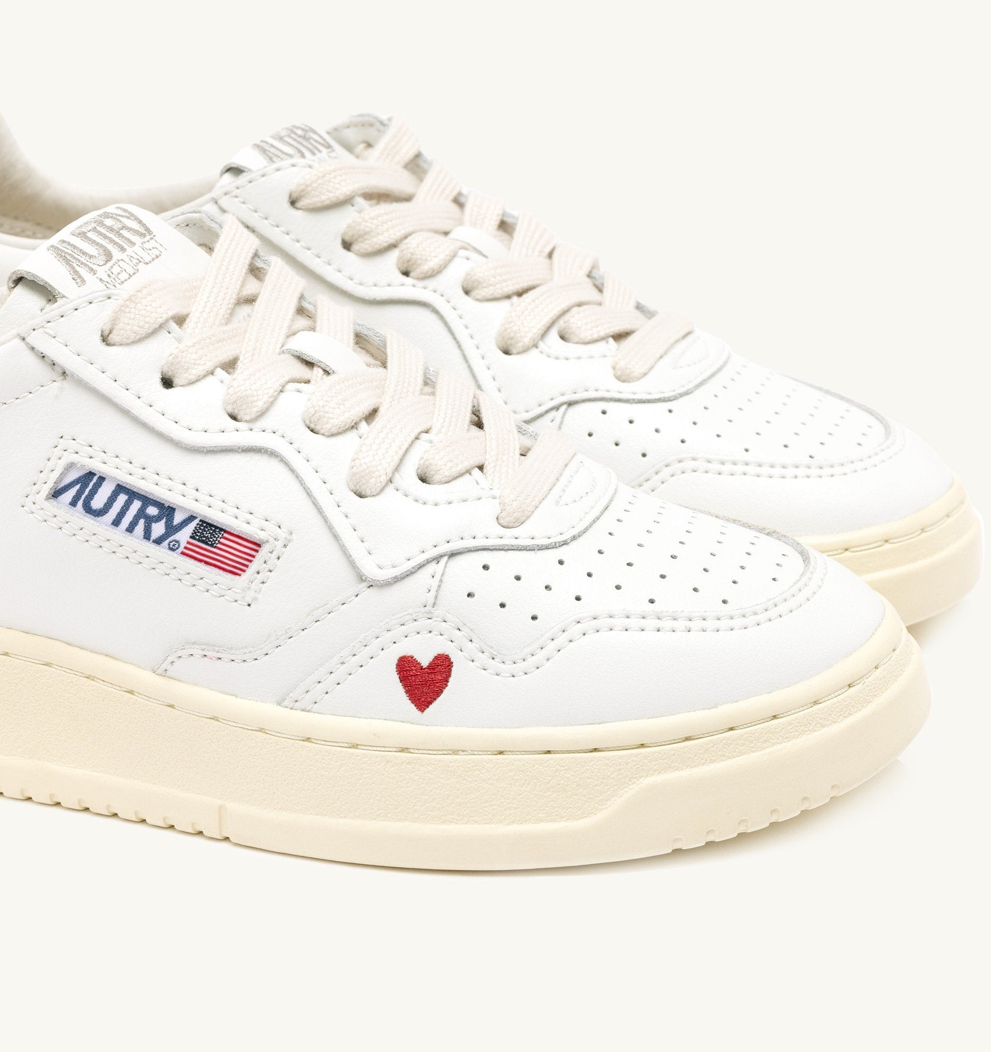 Confectionnée en cuir blanc de haute qualité, cette version exclusive est ornée de broderies rouges délicates : un logo cœur cousu sur le côté extérieur et un logo Autry sur le talon.