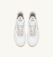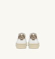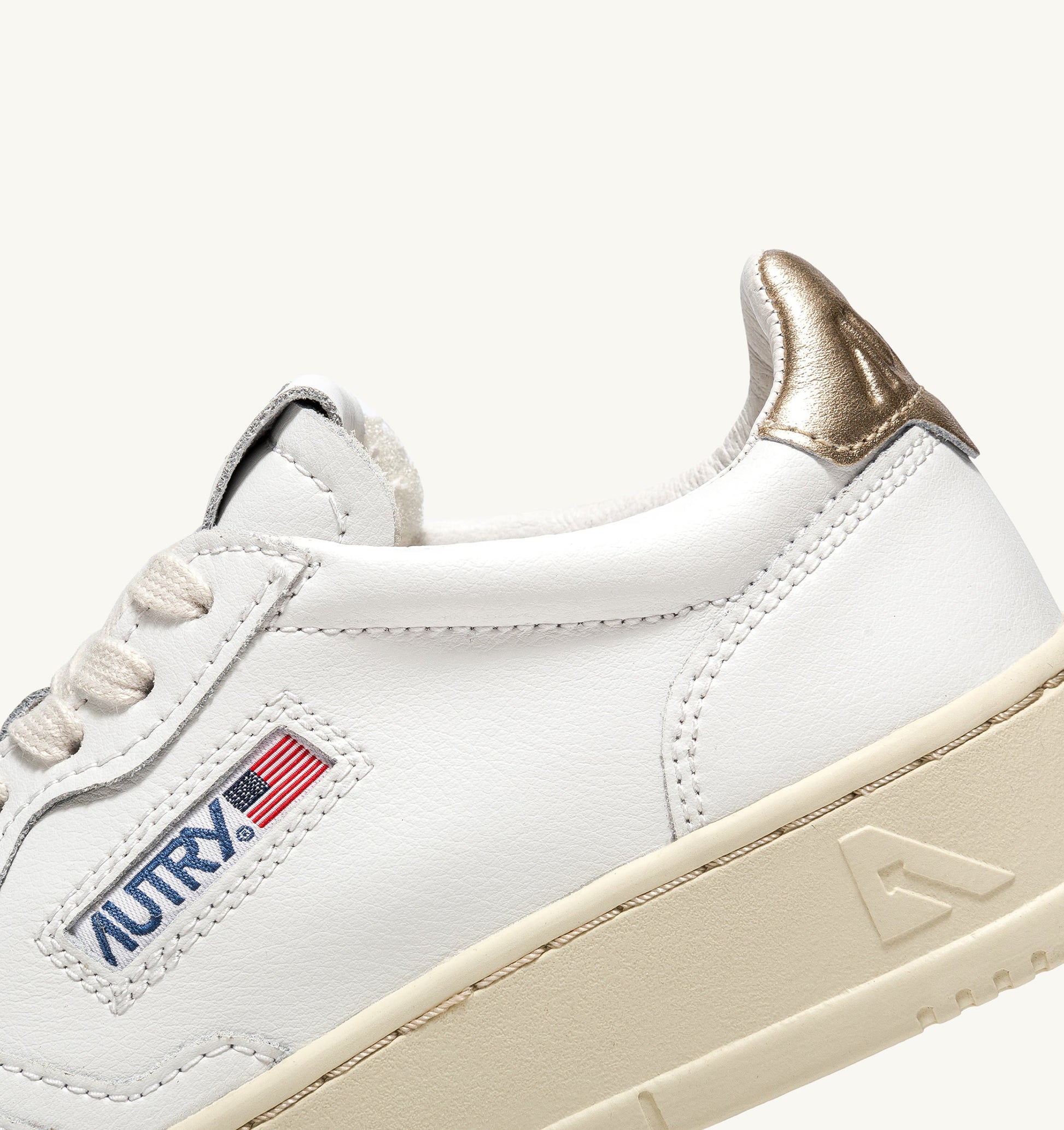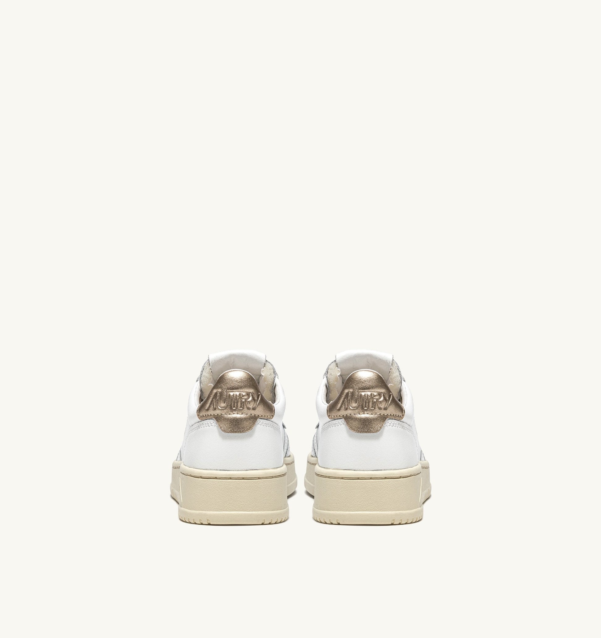 Ce modèle pour femme est confectionné en cuir blanc souple à l’aspect naturel, avec une pointe perforée qui assure une respirabilité optimale. Le détail en cuir métallisé doré au niveau du talon ajoute une touche luxe à cette silhouette sportive.