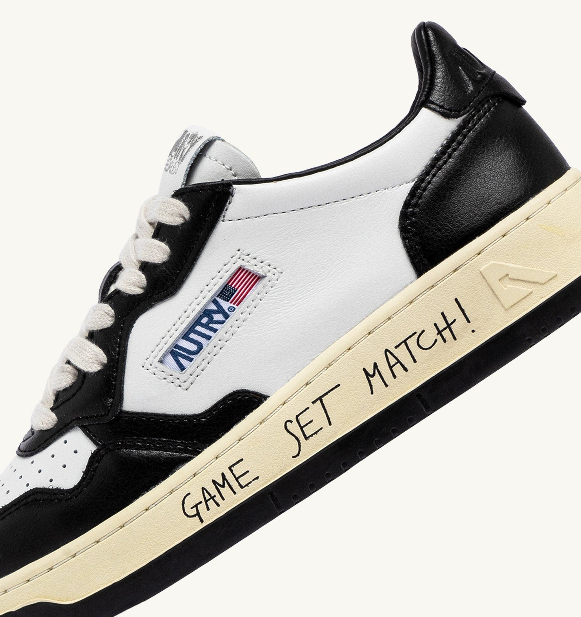 Sa semelle en gomme évoque instantanément l’univers du tennis, sublimée par l’inscription personnalisée “Game Set Match!” dans un style graffiti, pour une note urbaine et audacieuse.