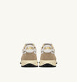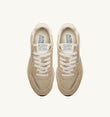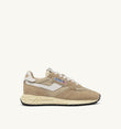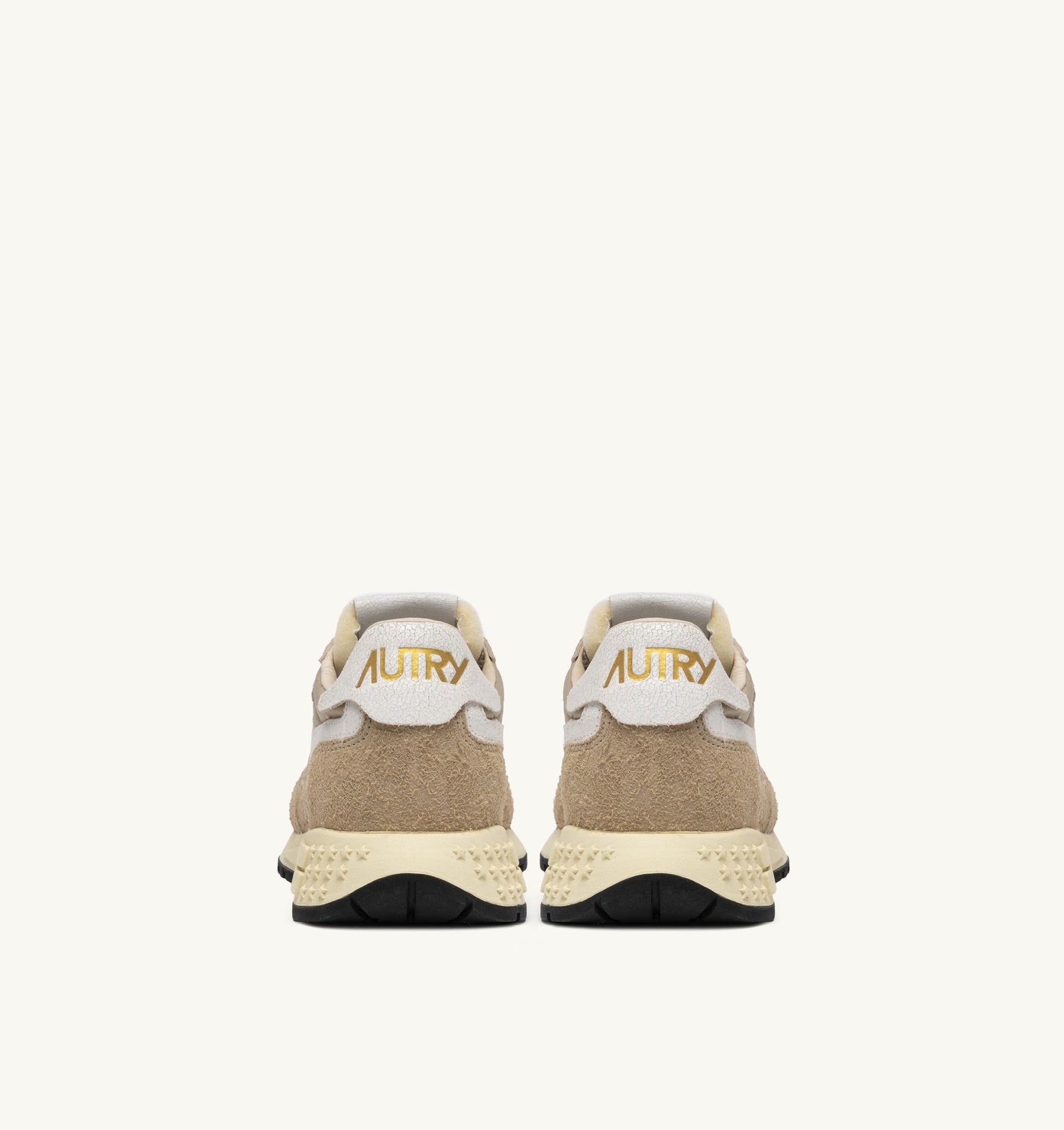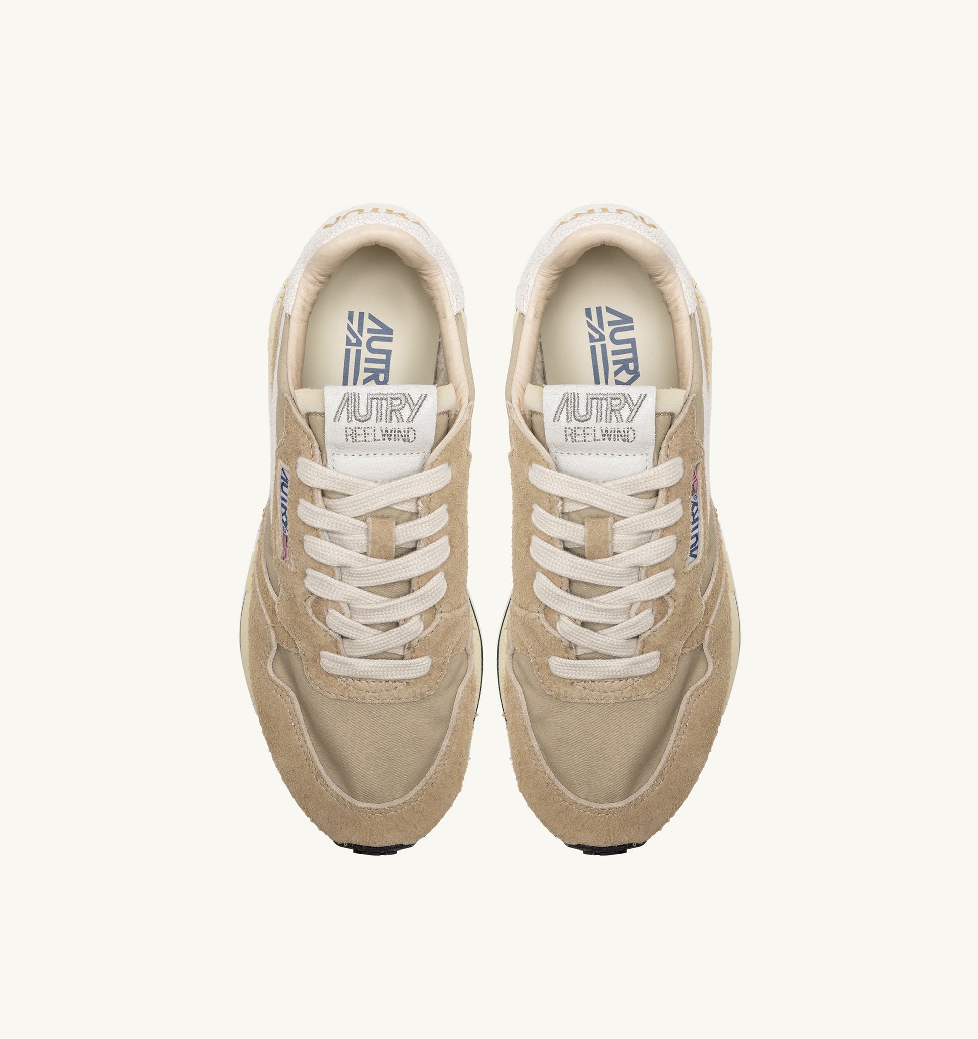 Reelwind est la sneaker Autry innovante, légère et extrêmement flexible, inspirée par l’univers du running. Le modèle femme est réalisé dans un mélange de suède et nylon beige, avec des empiècements en cuir craquelé blanc sur les côtés.