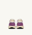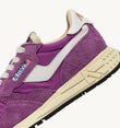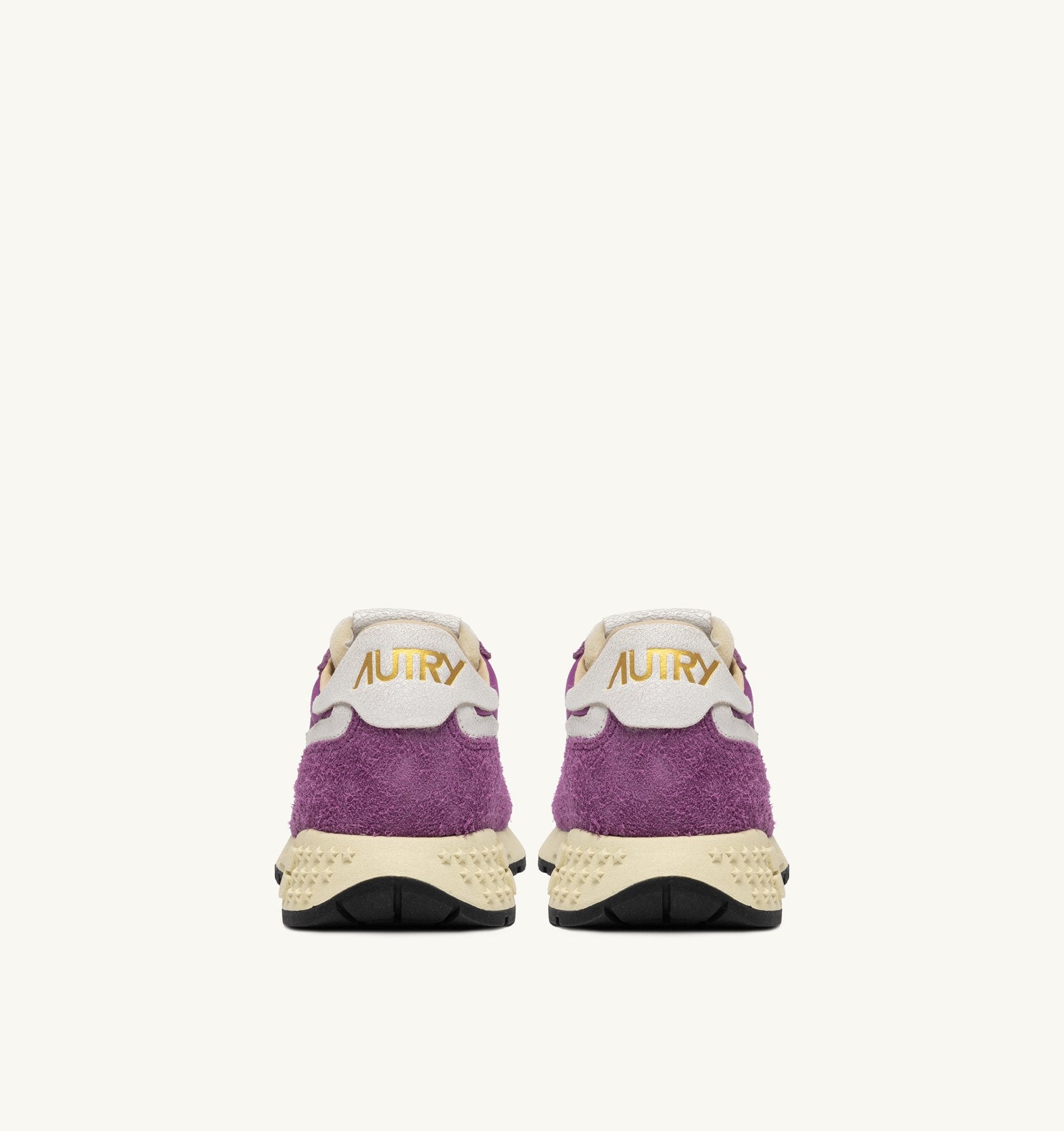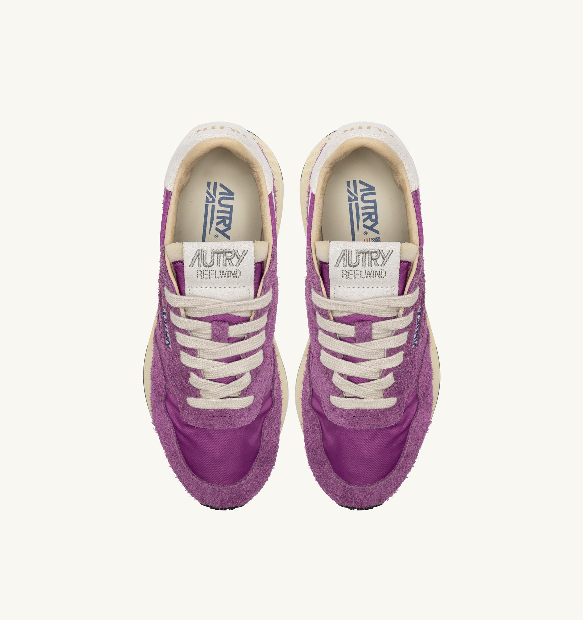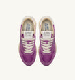 Ce modèle femme est confectionné dans un mélange de suede et nylon violet, avec des applications latérales en cuir craquelé blanc.