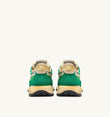 Ce modèle pour femme associe nylon vert, suede long hair, et empiècements latéraux en cuir craquelé gris, pour un jeu de matières audacieux et texturé.